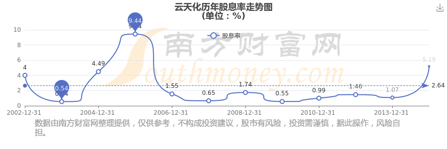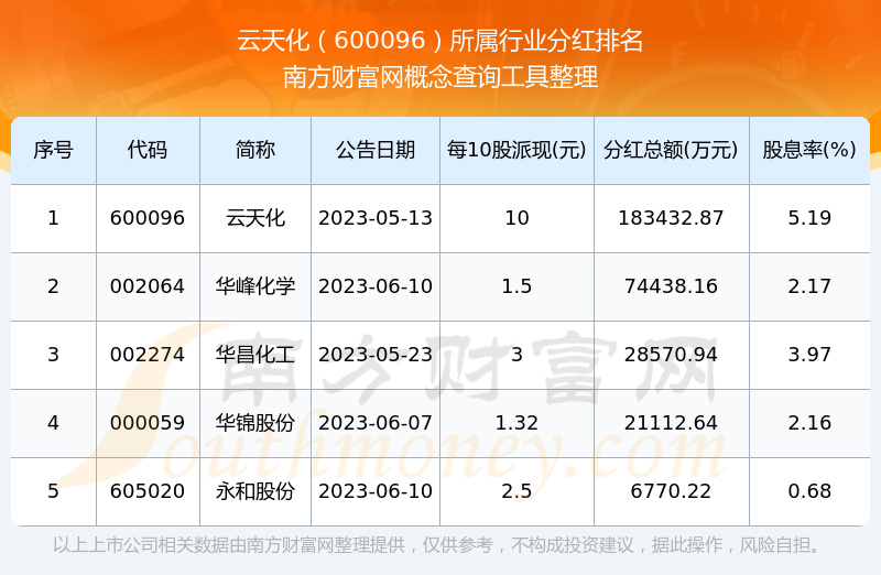 按照南方财富网趋势选股系统统计,云天化所属行业为磷化工行业,磷化工行业分红排名情况如下表: