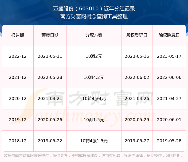 万盛股份最新一次公布的分红方案为10派2元。本次权益分派股权登记日为2023年5月16日,除权除息日为2023年5月17日,派息日为2023年5月17日。