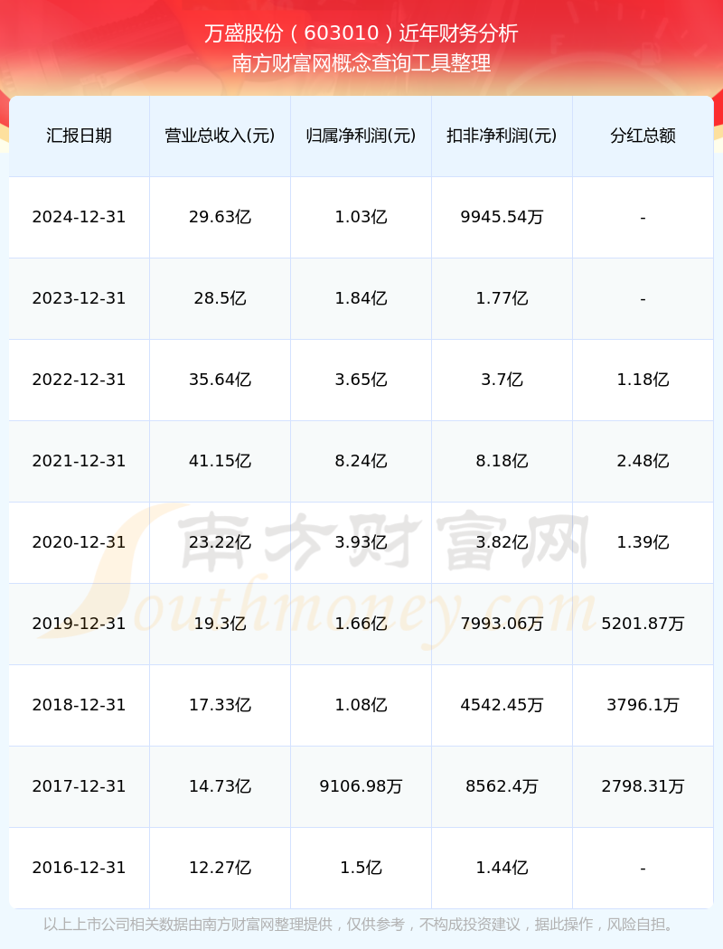 2024年报显示,万盛股份实现营收29.63亿,同比增长3.97%;净利润1.03亿,同比增长-43.72%;毛利率18.48%。