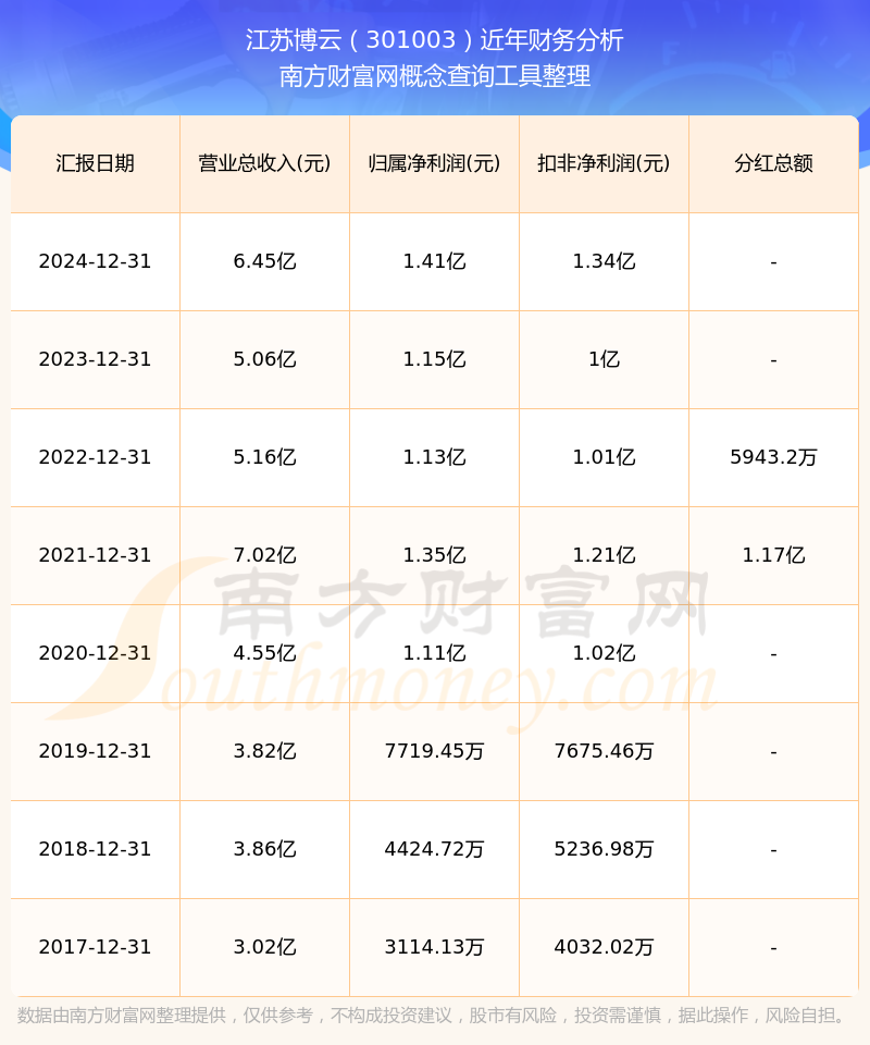 江苏博云2024年总营收6.45亿,同比增长27.37%;净利润1.41亿,同比增长22.24%;销售毛利率32.1%。