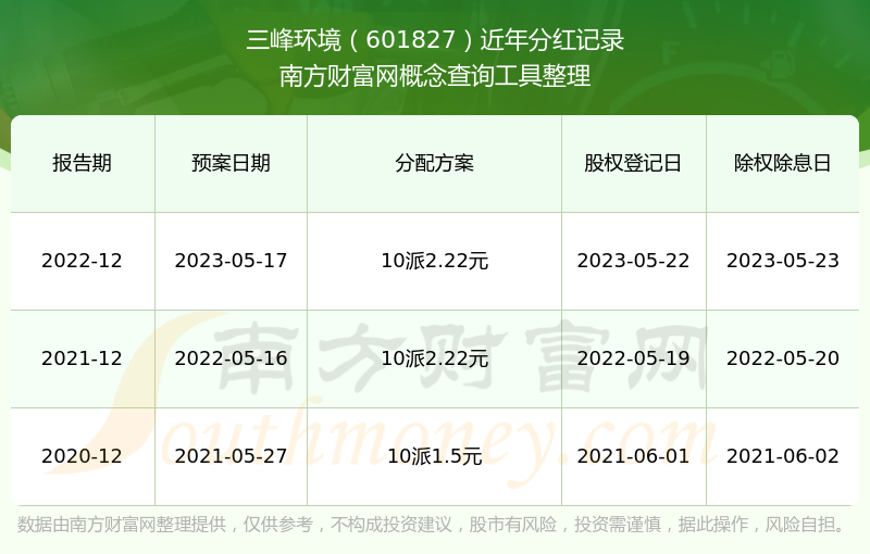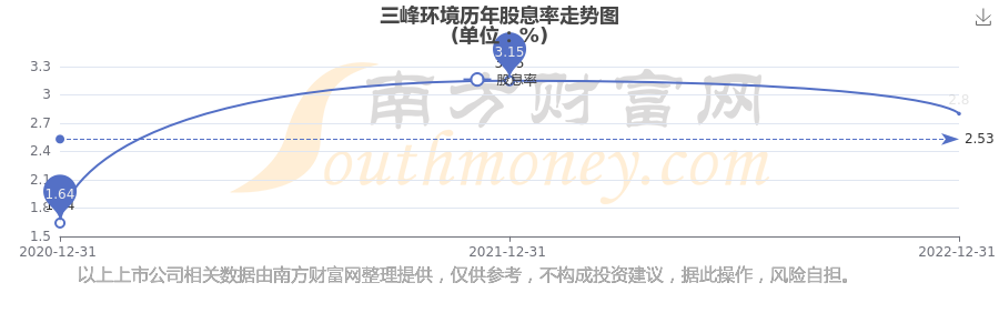 三峰环境最新一次公布的分红方案:10派2.22元。
