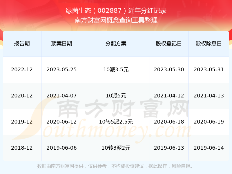 绿茵生态历年分红派息情况如下表所示: