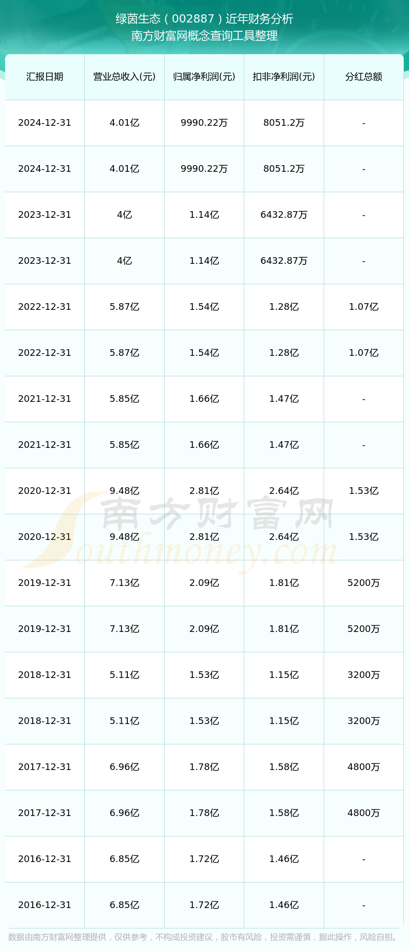 绿茵生态2024年总营收4.01亿,同比增长0.28%;净利润9990.22万,同比增长-12.06%;销售毛利率46.4%。