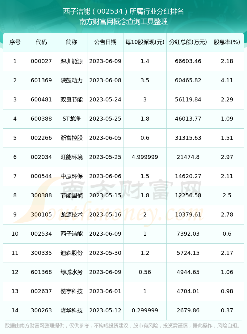 按照南方财富网趋势选股系统统计,西子洁能所属行业为电源设备行业,电源设备行业分红排名情况如下表: