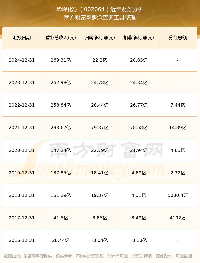 公司2024年实现营业收入269.31亿元,同比增长2.41%;净利润22.2亿元,同比增长-10.43%;毛利率13.83%。