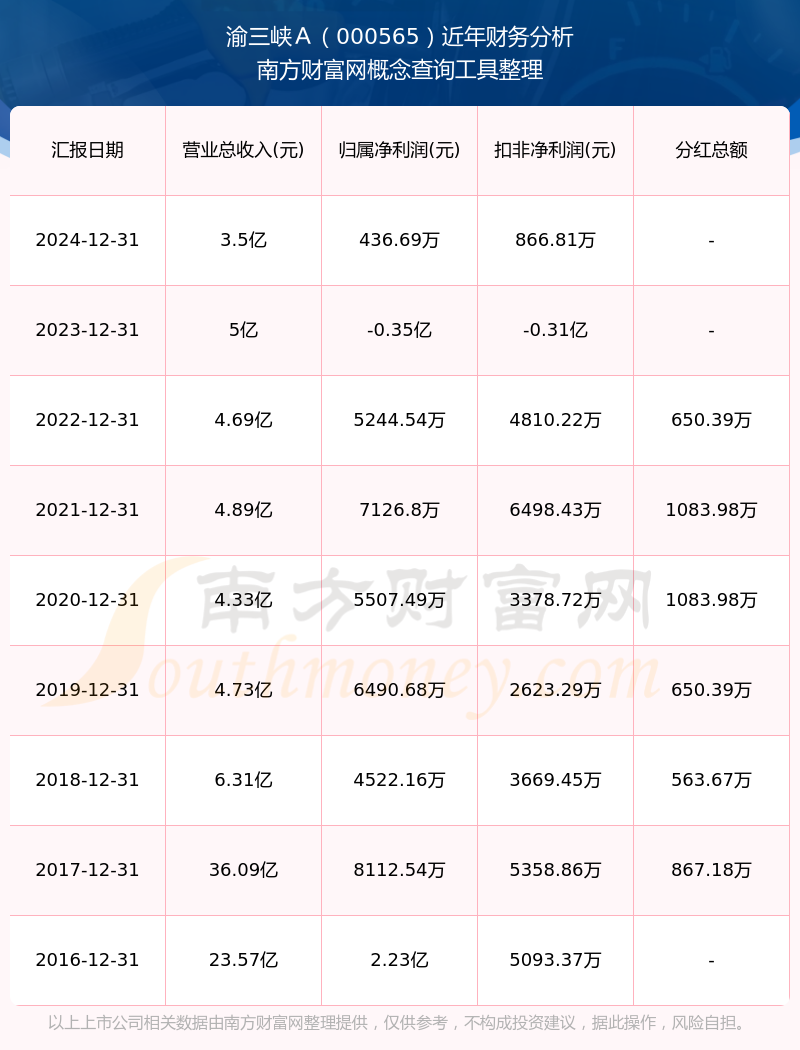 渝三峡A2024年总营收3.5亿,同比增长-29.94%;净利润436.69万,同比增长112.54%;销售毛利率22.63%。