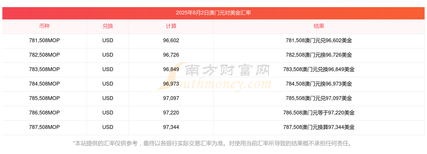 2025年8月2日汇率行情:18澳门元对美金汇率多少