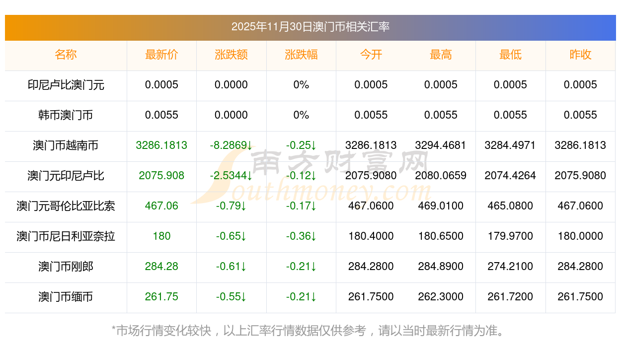 2025年11月30日最新消息,澳门币兑换刚郎最新汇率为284.280000,今开为284.2800,昨收为284.2800,最高为284.8900,最低为274.2100。