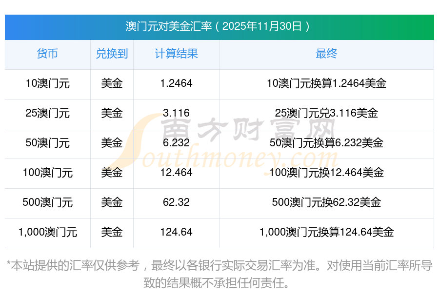 2025年11月30日汇率行情:34澳门元对美金汇率多少