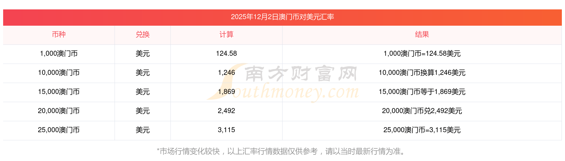 2025年12月2日汇率行情:41澳门币对美元汇率多少