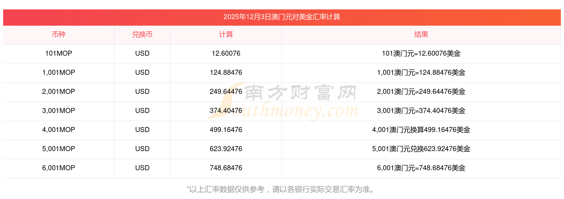 2025年12月3日汇率行情:41澳门元对美金汇率多少