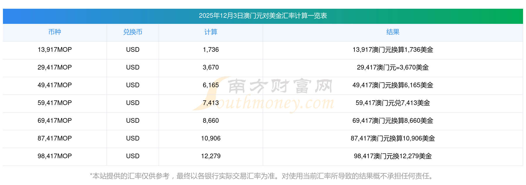 2025年12月3日汇率行情:38澳门元对美金汇率多少