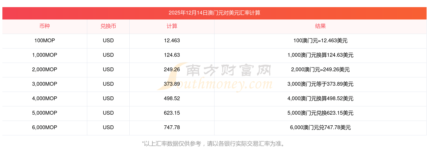 2025年12月14日汇率行情:45澳门元对美元汇率多少