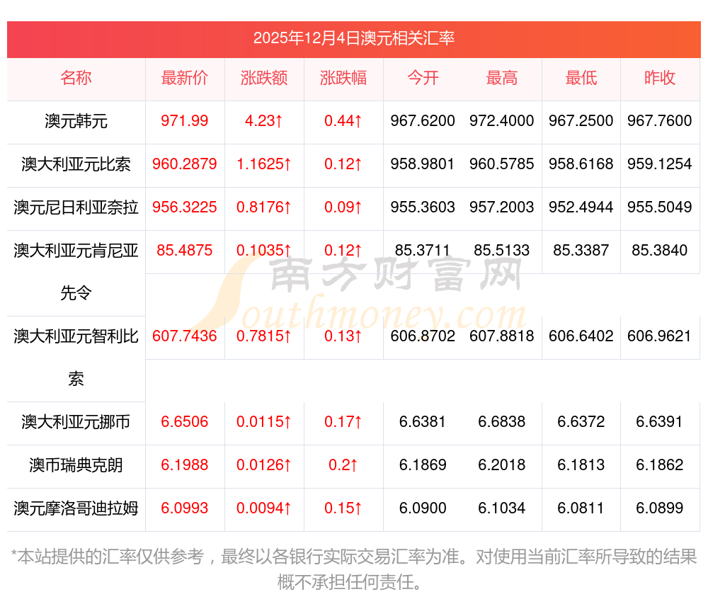 根据今天2025年12月4日汇率计算,AUD兑换ZAR汇率最新价11.276900,今开价11.2467,昨收价11.2462,最高价11.2817,最低价11.2400。