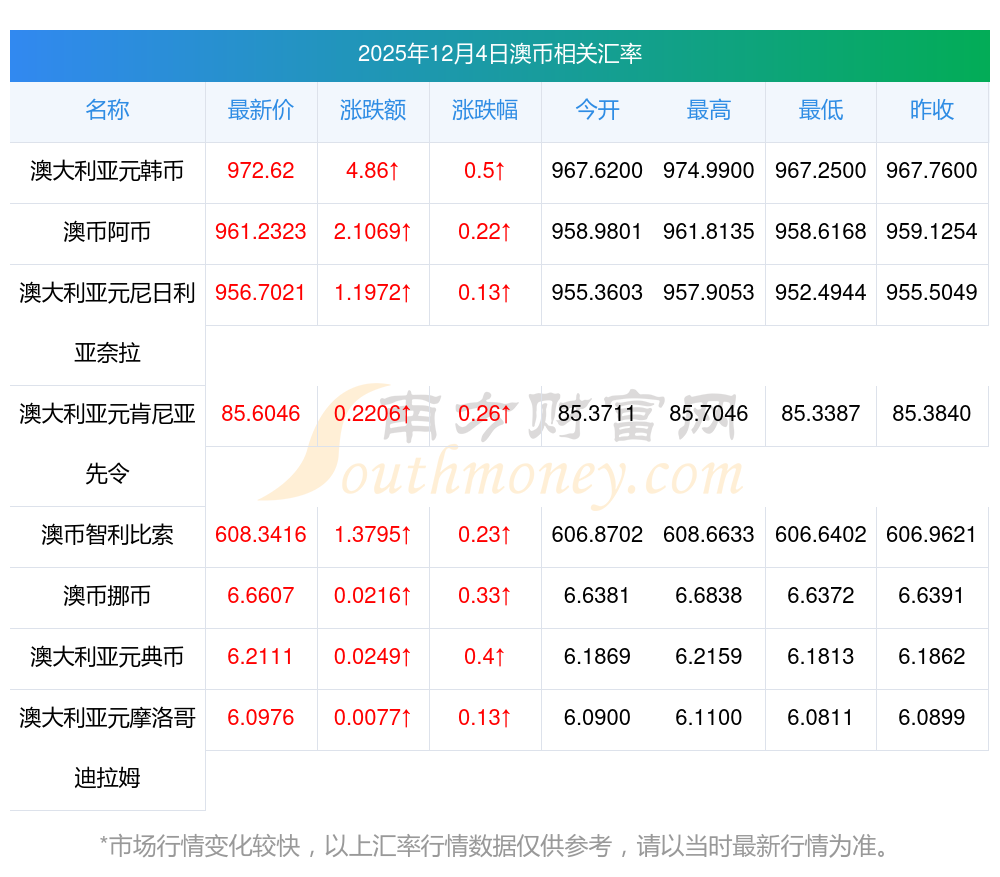 2025年12月4日澳币相关汇率查询