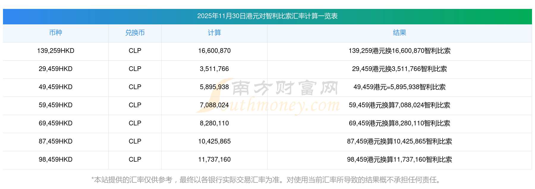 港元对智利比索折算价如何计算?中间价多少?2025-11-30