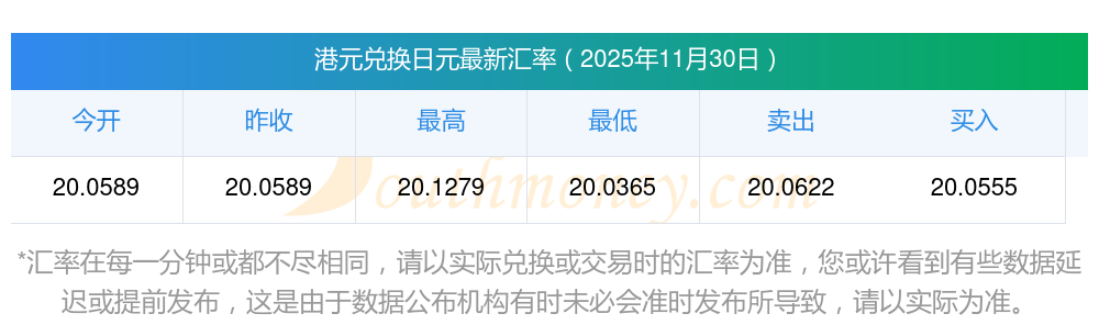 今天汇率调整 港币与日元的汇率是多少?2025/11/30