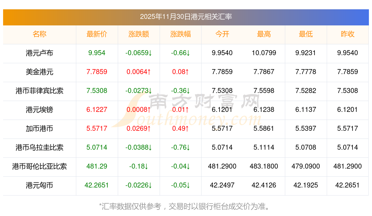 2025年11月30日最新消息,港元兑换克朗最新汇率为2.672700,今开为2.6727,昨收为2.6727,最高为2.6873,最低为2.6727。