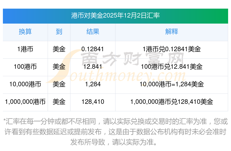 2025年12月2日美金汇率行情:3港币对美金汇率多少