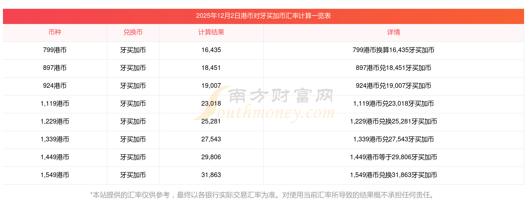 货币兑换:港币兑换牙买加币汇率行情(2025年12月2日)