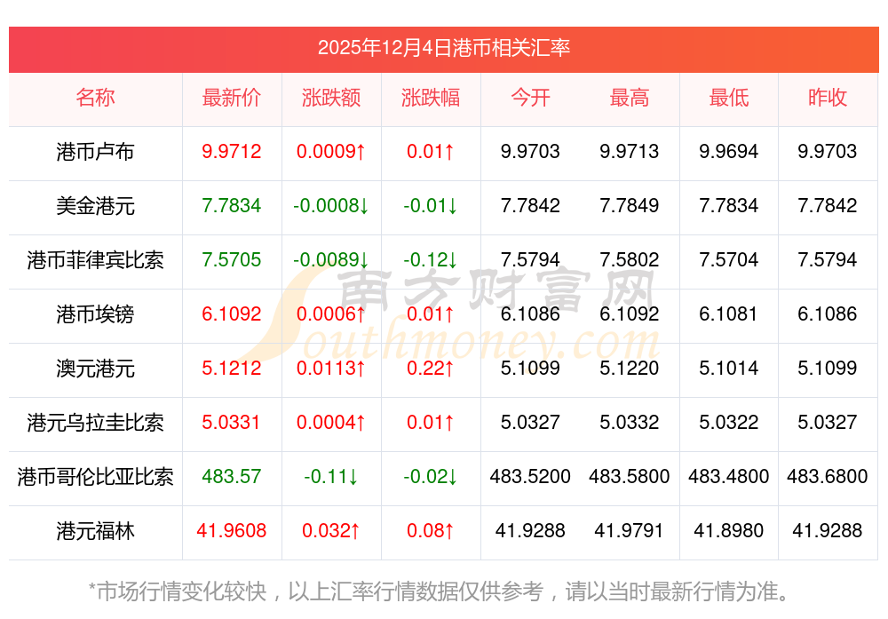 2025年12月4日最新消息,港币兑换台币最新汇率为4.025500,今开为4.0247,昨收为4.0247,最高为4.0286,最低为4.0223。