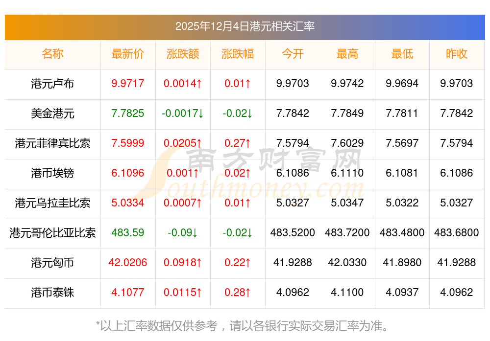2025年12月4日港元相关汇率查询