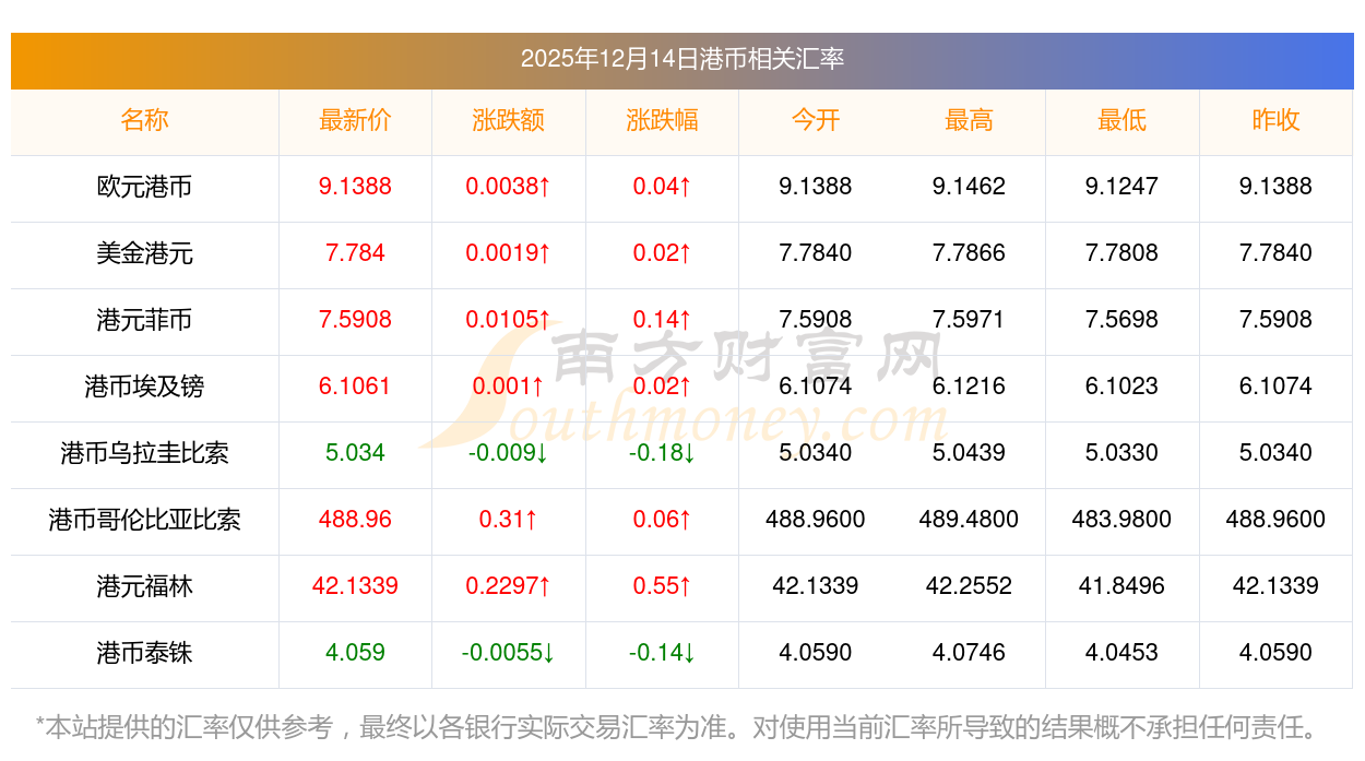 2025年12月14日港币相关汇率查询