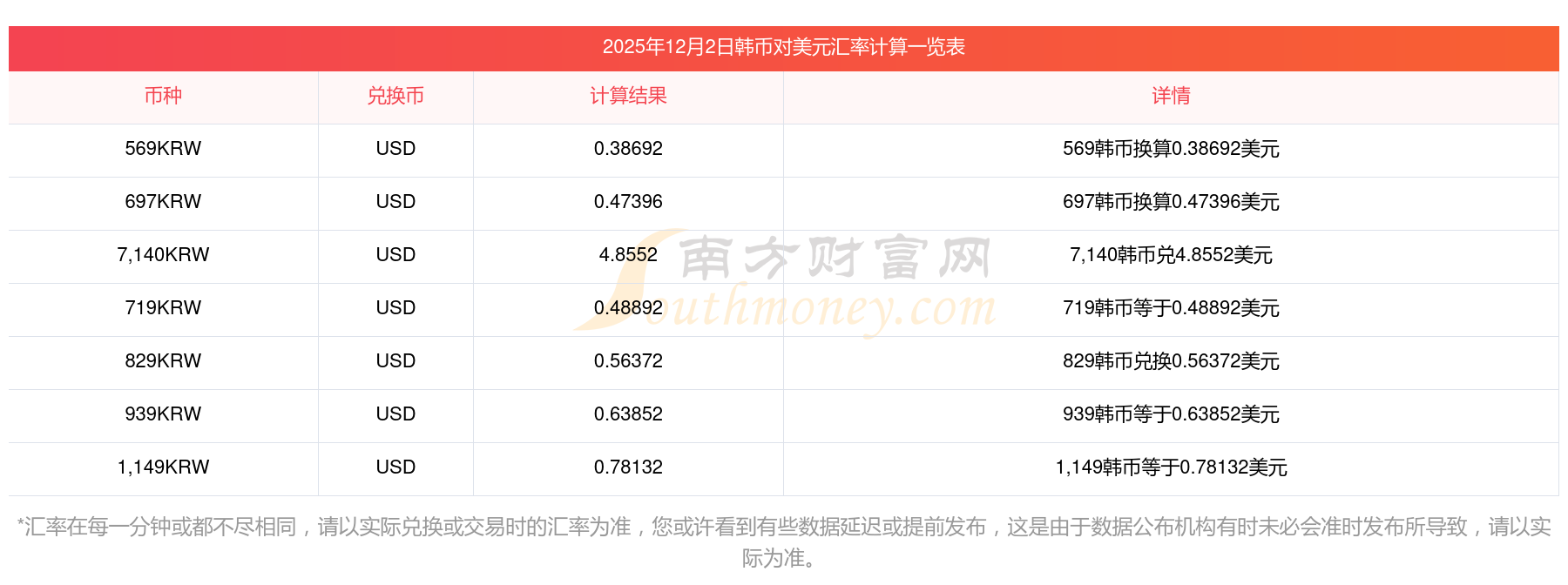2025年12月2日汇率行情:9韩币对美元汇率多少