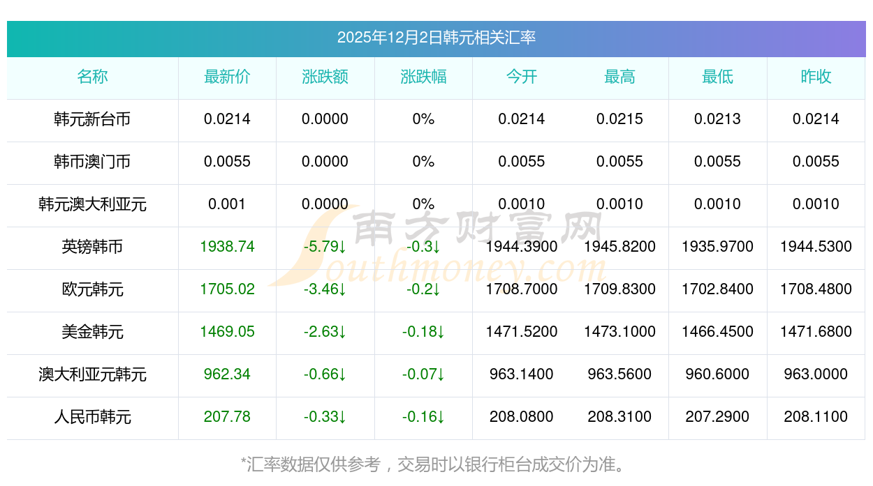 根据2025年12月2日汇率,韩元兑换马来西亚币汇率最新价0.002814,今开价0.0028,昨收价0.0028,最高价0.0028,最低价0.0028。