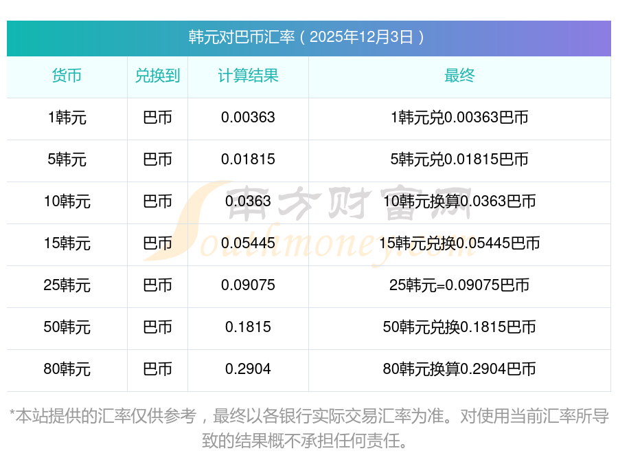 南方财富网为您提供韩元对巴币汇率最新价格详情。