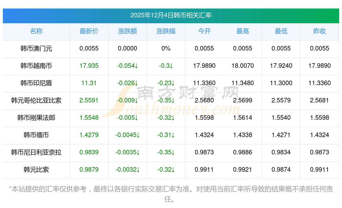 2025年12月4日韩币相关汇率查询