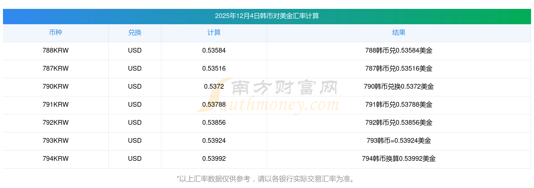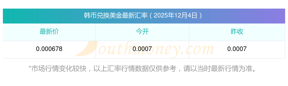 今日韩币汇价:2025年12月4日27韩币兑美金汇价一览表