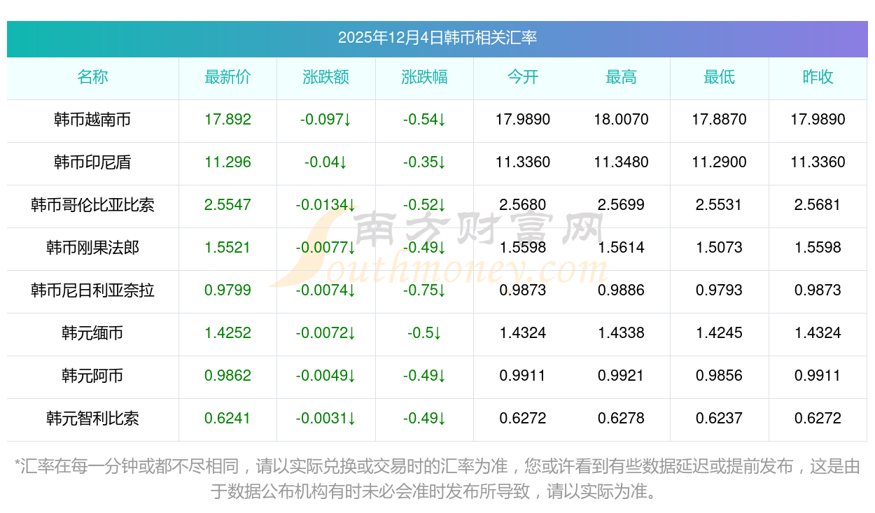 根据2025年12月4日汇率计算,韩币兑换菲律宾比索汇率最新价0.040073,今开价0.0402,昨收价0.0402,最高价0.0403,最低价0.0401。
