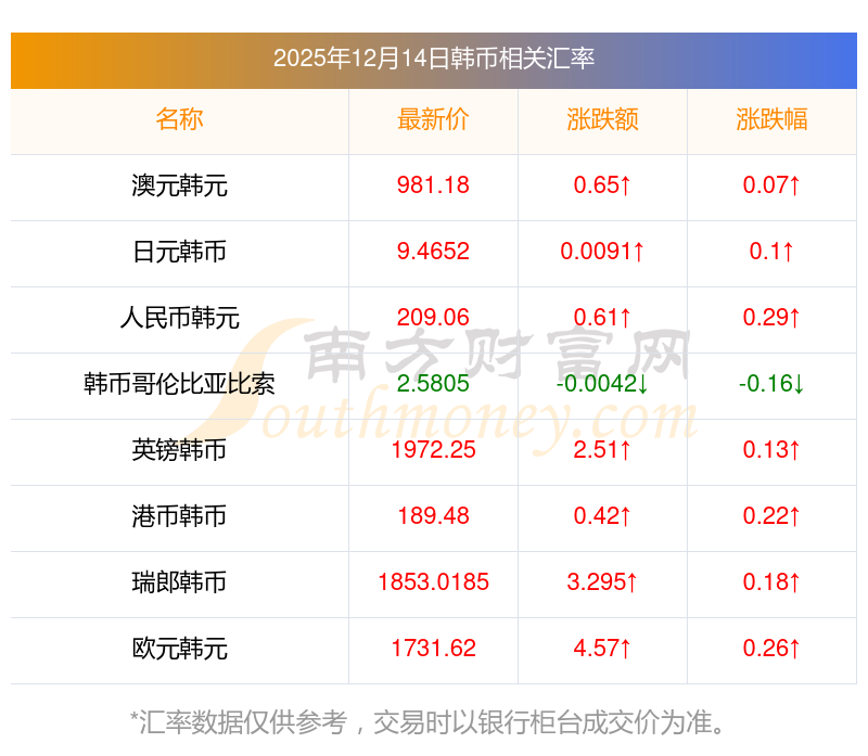根据2025年12月14日汇率计算,KRW兑换MXN汇率最新价0.012215:今开价0.0123,昨收价0.0122,最高价0.0123,最低价0.0122。