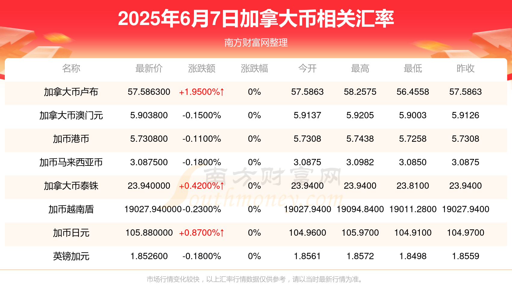 2025年6月7日加拿大币相关汇率查询