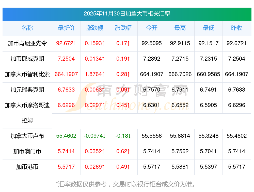 根据2025年11月30日汇率,加拿大币兑换摩洛哥迪拉姆汇率最新价6.629600,今开价6.6301,昨收价6.6296,最高价6.6552,最低价6.5905。