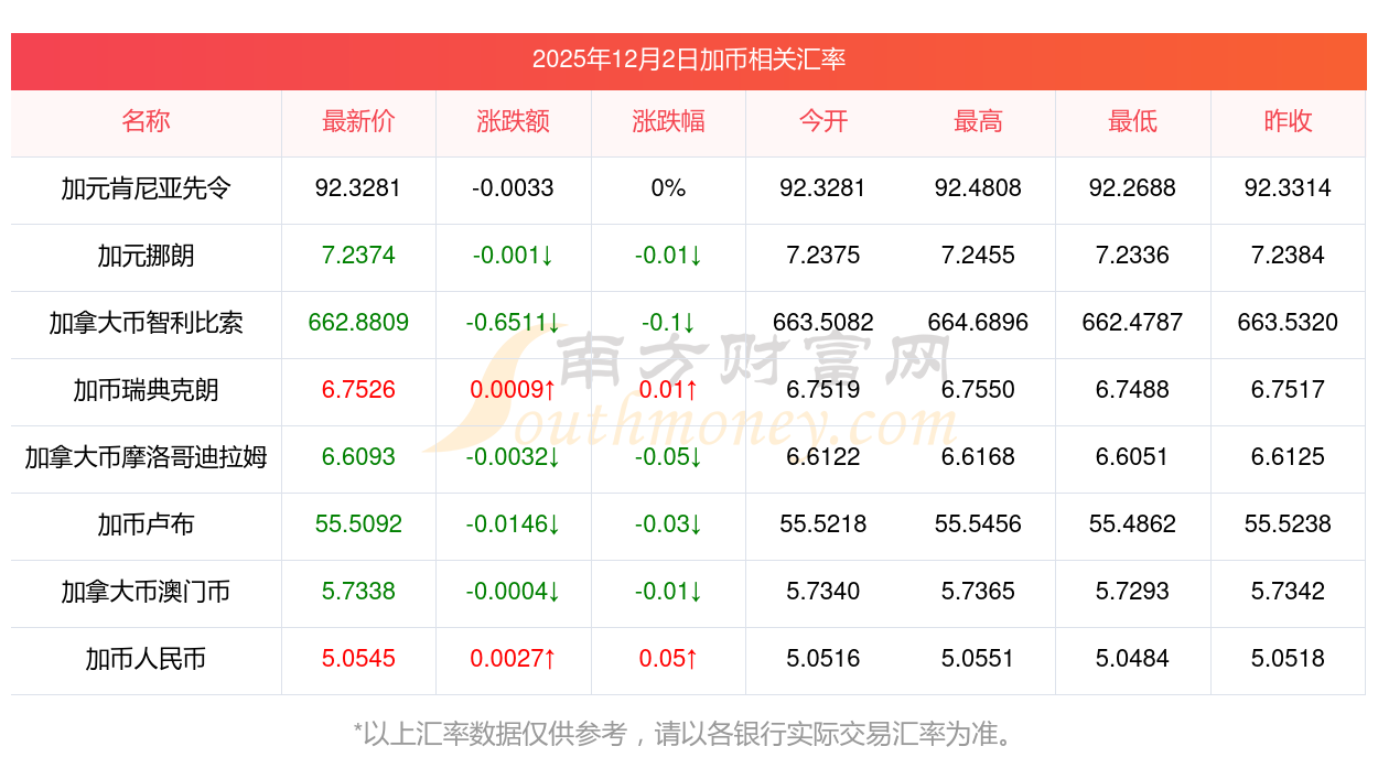 根据2025年12月2日汇率计算,CAD兑换EGP汇率最新价33.960700,今开价33.9453,昨收价33.9465,最高价33.9822,最低价33.9235。