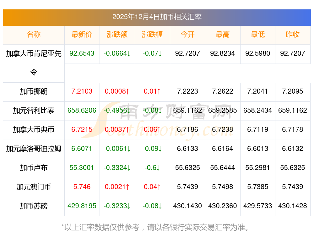 根据今天2025年12月4日汇率计算,CAD兑换SGD汇率最新价0.928300,今开价0.9273,昨收价0.9274,最高价0.9288,最低价0.9270。