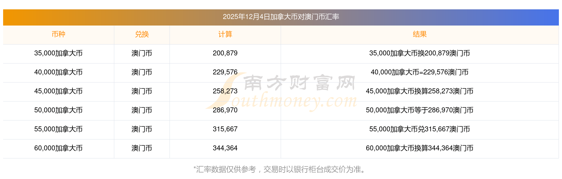 汇率调整2025-12-4 加拿大币对澳门币汇率计算表