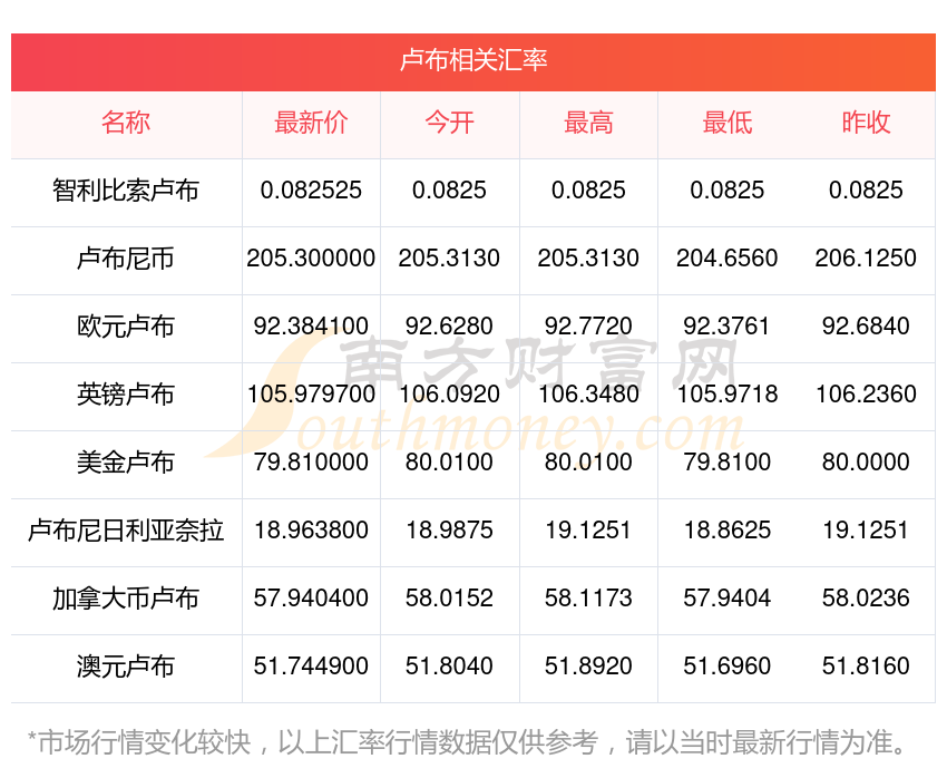南方财富网为您提供卢布对人民币汇率最新价格详情。