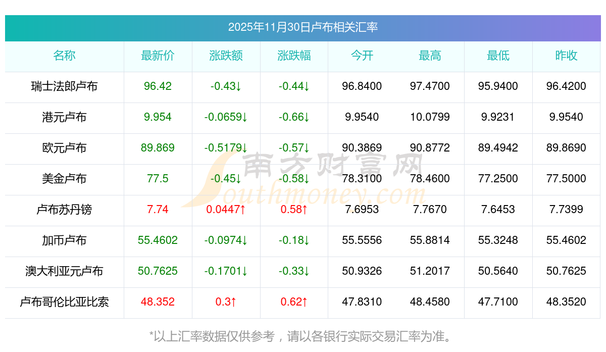 2025年11月30日卢布兑换秘鲁新索尔最新汇率:0.043381,今开:0.0430,昨收:0.0434,最高:0.0435,最低:0.0429。