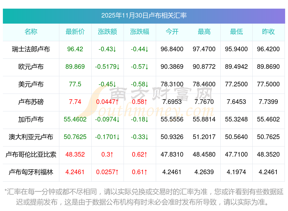 2025年11月30日卢布兑换刚果法郎最新汇率:29.430000,今开:29.4300,昨收:29.4300,最高:29.5200,最低:28.3400。