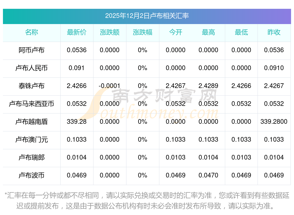 南方财富网为您提供卢布对人民币汇率最新价格详情。