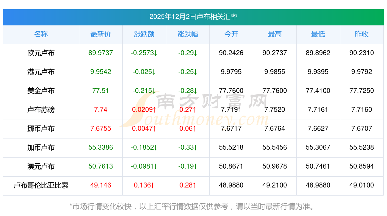 根据今天2025年12月2日汇率计算,RUB兑换CUP汇率最新价0.309636,今开价0.3088,昨收价0.3088,最高价0.3100,最低价0.3086。