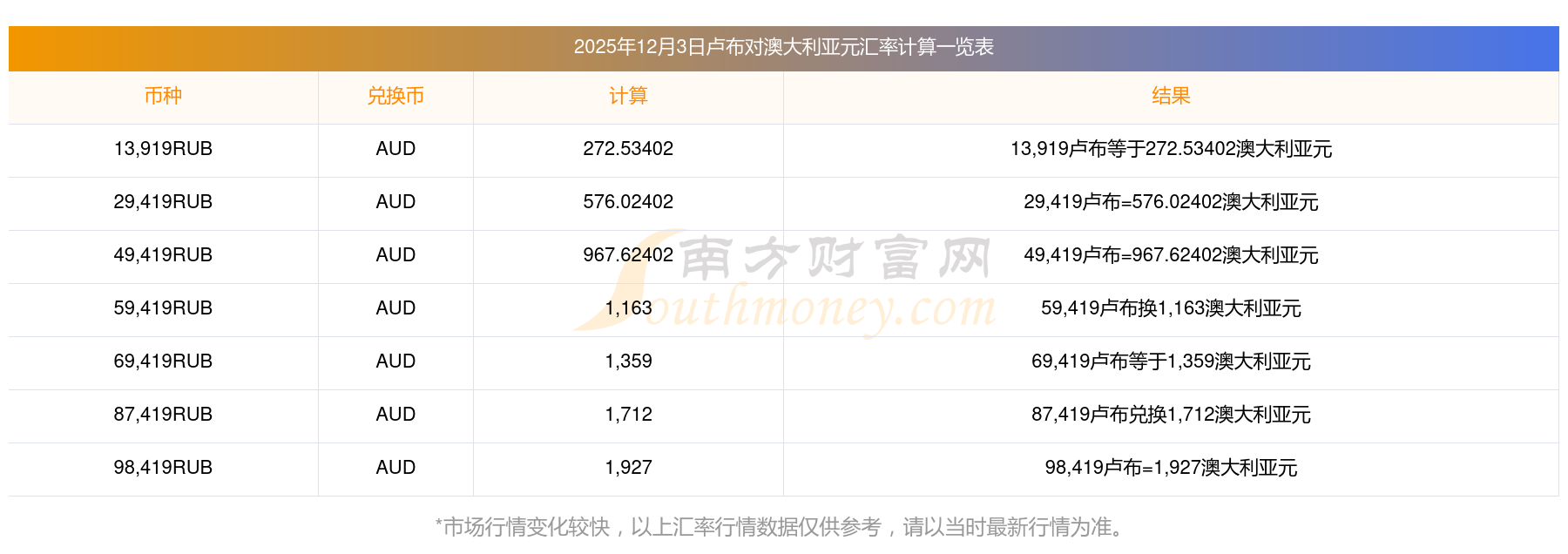 南方财富网为您提供卢布对澳大利亚元汇率最新价格详情。