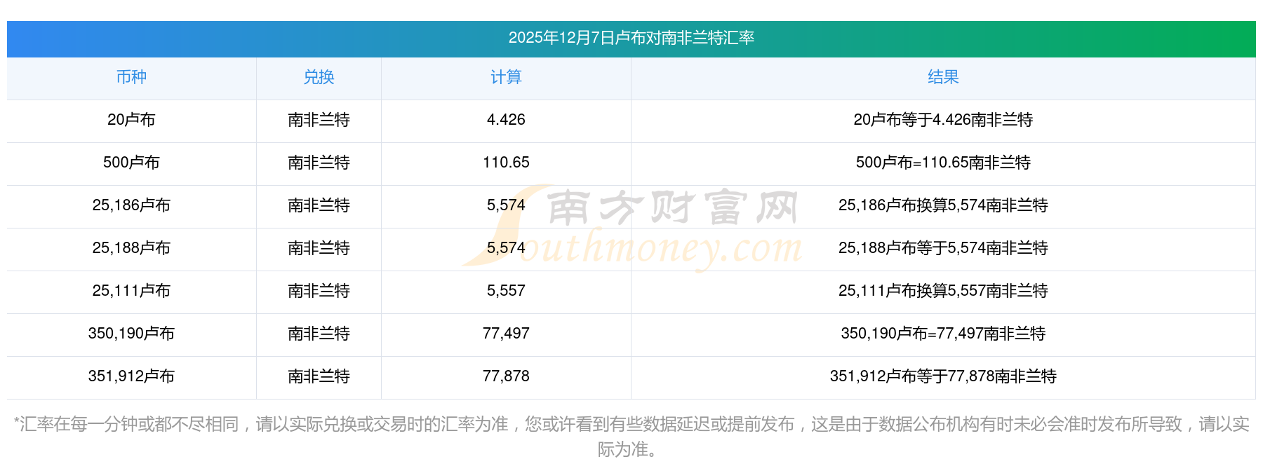 今天汇率更新!2025年12月7日57卢布兑换南非兰特是多少?