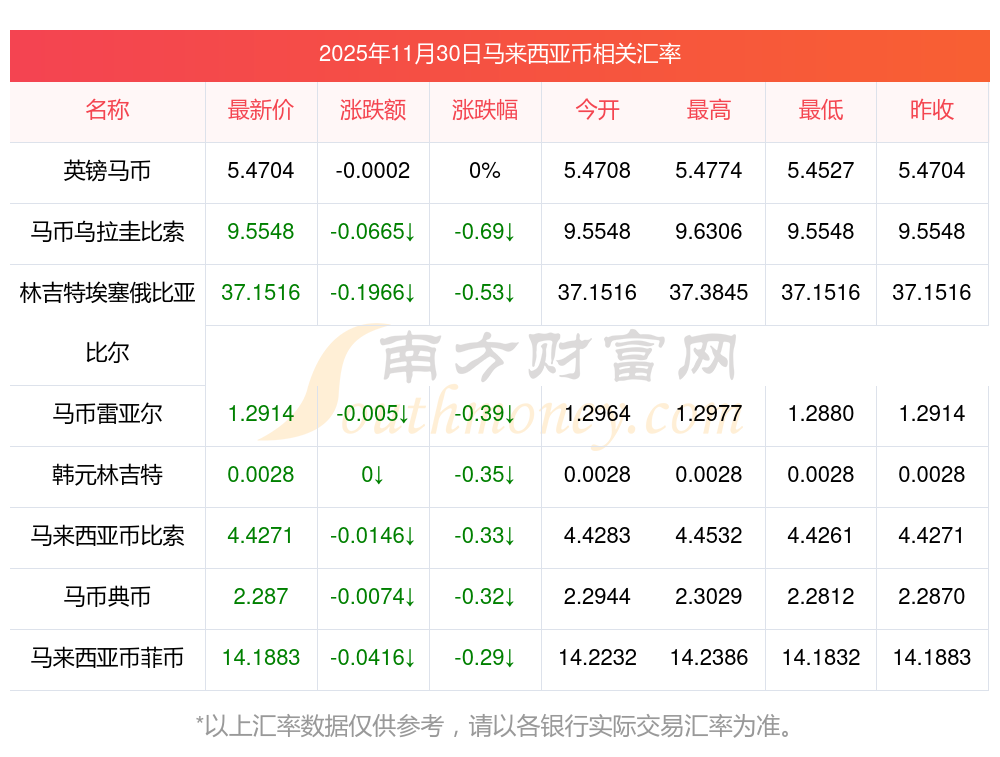 根据2025年11月30日汇率,马来西亚币兑换比索汇率最新价4.427100,今开价4.4283,昨收价4.4271,最高价4.4532,最低价4.4261。