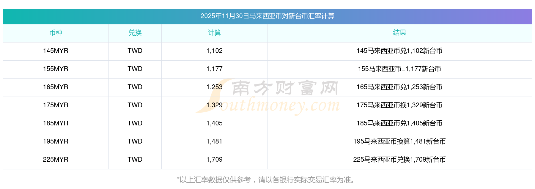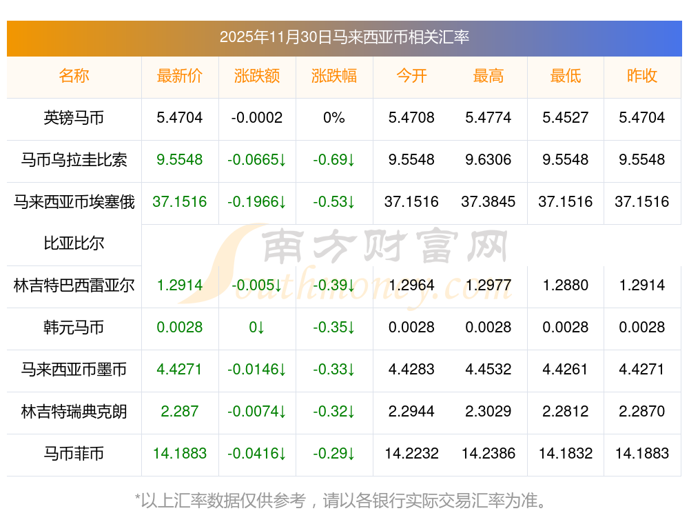 今日马来西亚币对新台币最新汇率查询表2025/11/30
