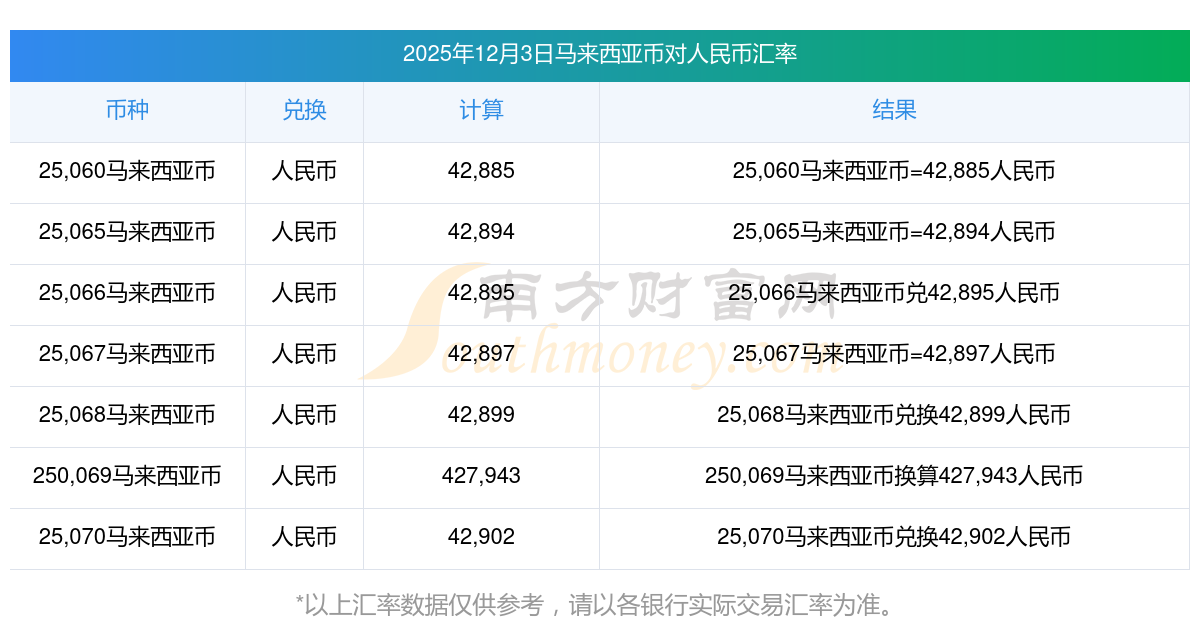 2025年12月3日马来西亚币与人民币的兑换汇率计算如下: