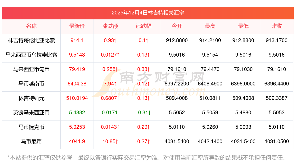 根据2025年12月4日汇率计算,MYR兑换ZAR汇率最新价4.145100,今开价4.1324,昨收价4.1322,最高价4.1466,最低价4.1315。